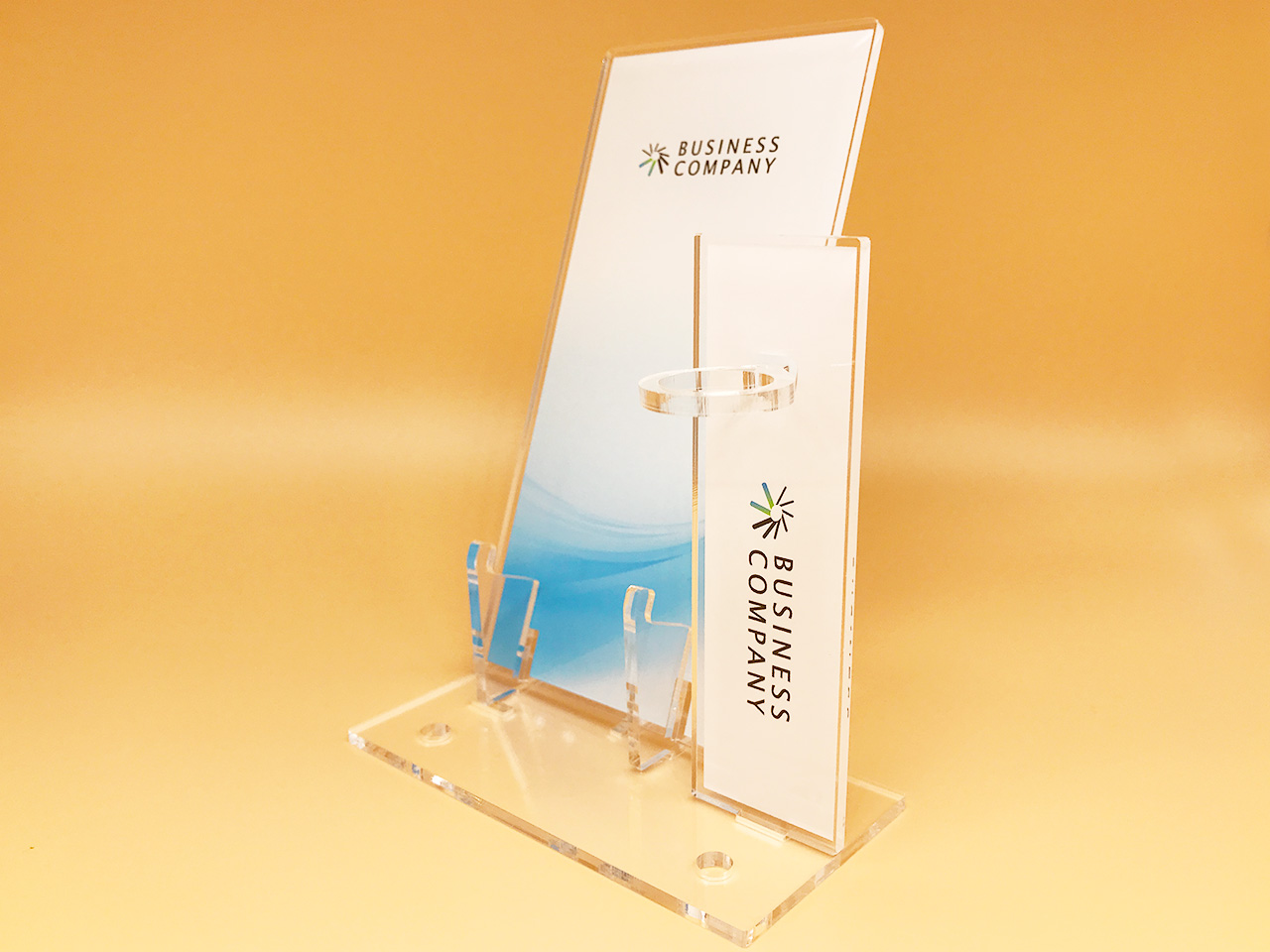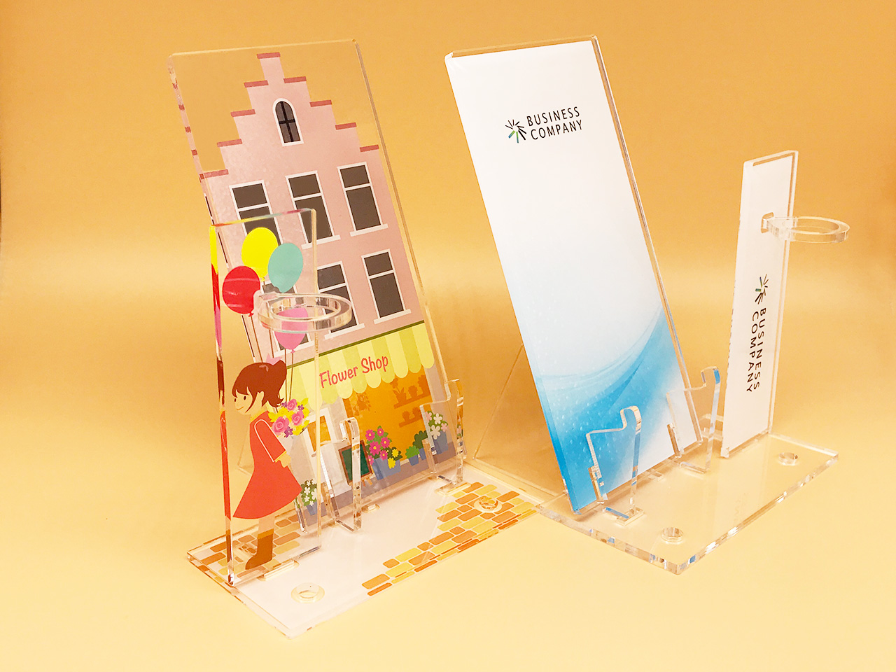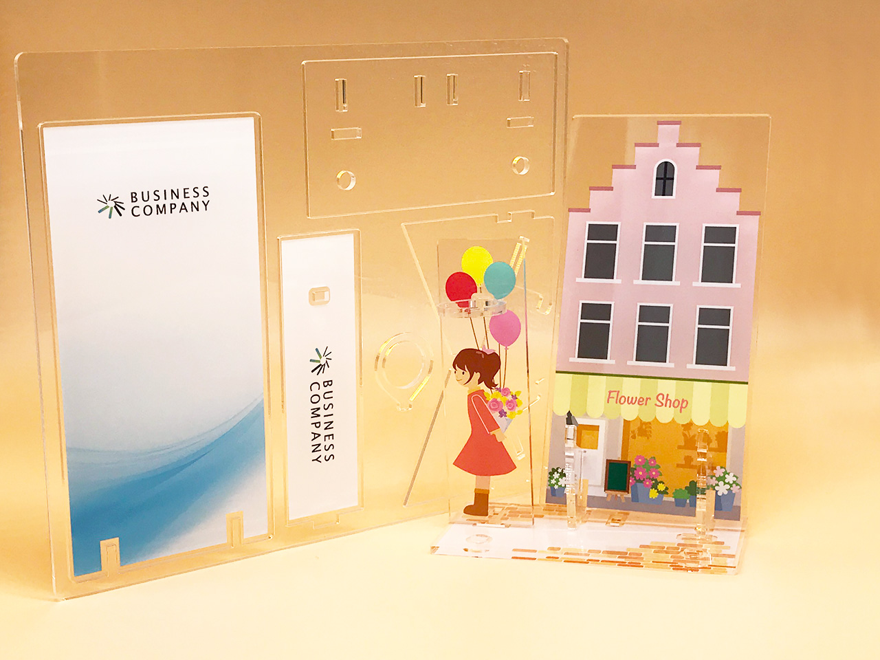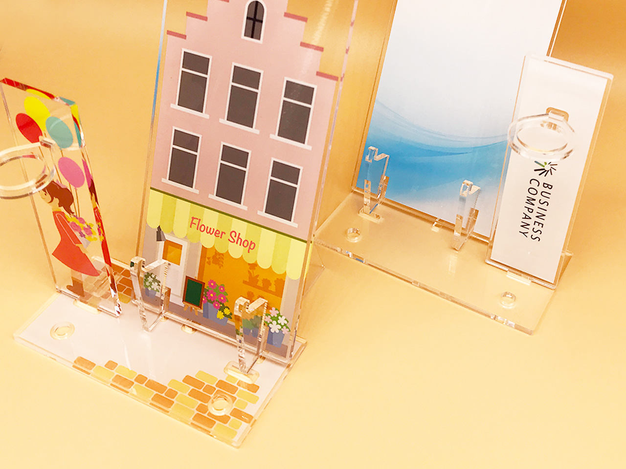 3wayアクスタは、「スマホスタンド」背面と「タイトルパーツ」が長方形です。シンプルな形状なので、ロゴや写真、オリジナルデザインを印刷することで簡単におしゃれなグッズを作成できます。※アクリルを自由にカットできるオリジナル型につきましては、お客様のご要望により対応が可能ですので、お気軽にお問い合わせください。