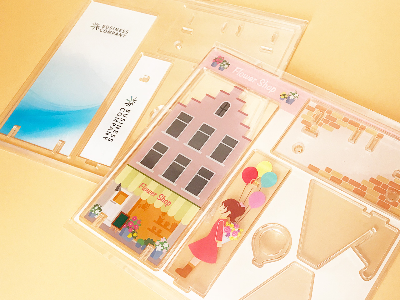 3wayアクスタは、一枚のアクリル板にすべてのパーツを仮止めでプレートに固定しており、シールを使用しないため、本体に跡が残る心配はございません。無料のOPP袋に個別包装して納品いたします。取り扱い説明書もお付けしております。
