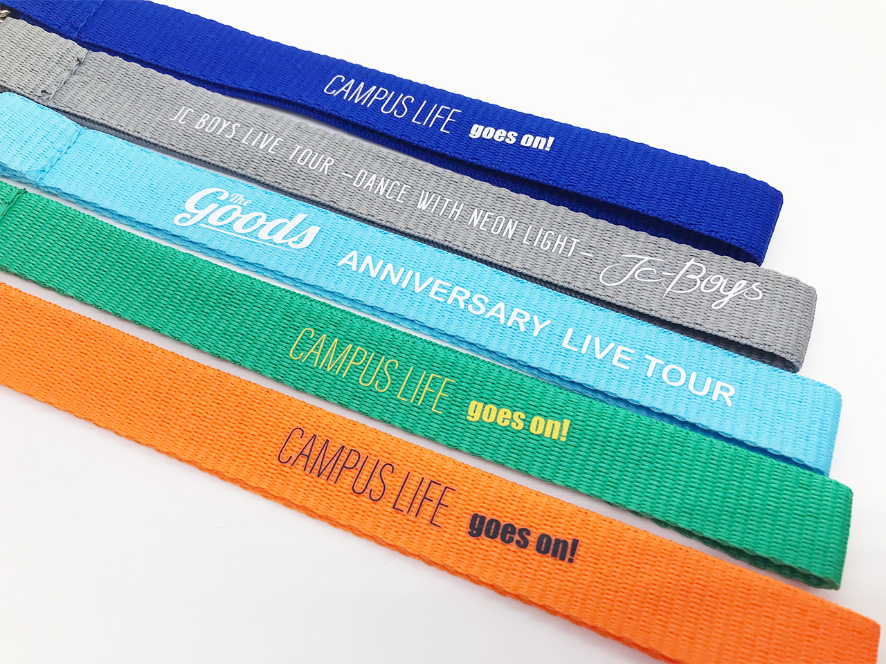 ストラップのカラーは全9色ご用意しております。コーポレートカラー、イベントのイメージに合わせて色をお選びいただけます。Pantone色番指定をご希望の場合は、別途染色代@10,000円)が加算されます。- ブラック