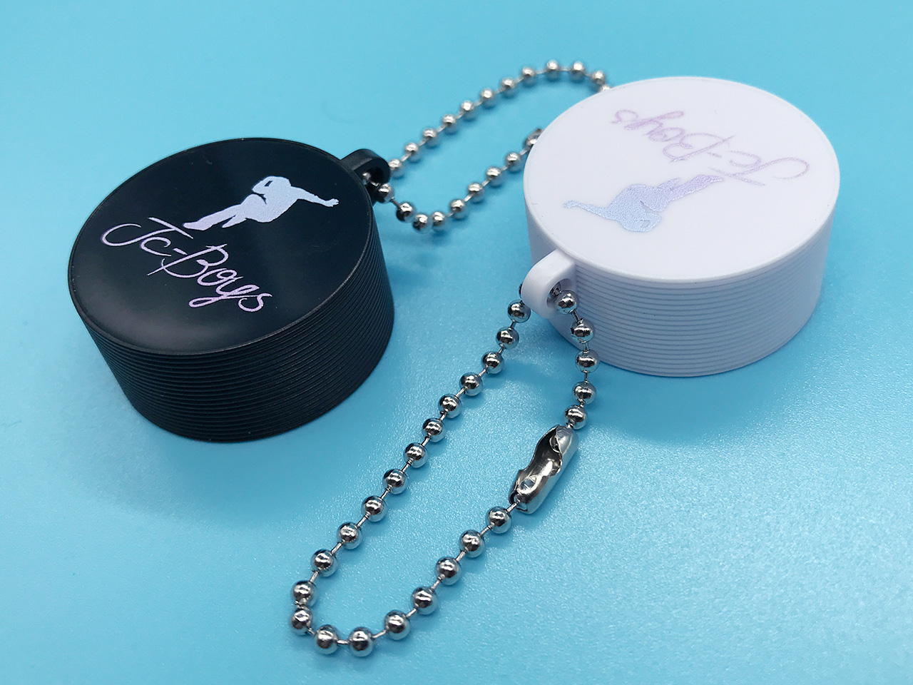 ボールチェーン付きキャップは、白か黒のどちらかをお選びください。キャップにはワンポイント印刷(@50円)が可能です。